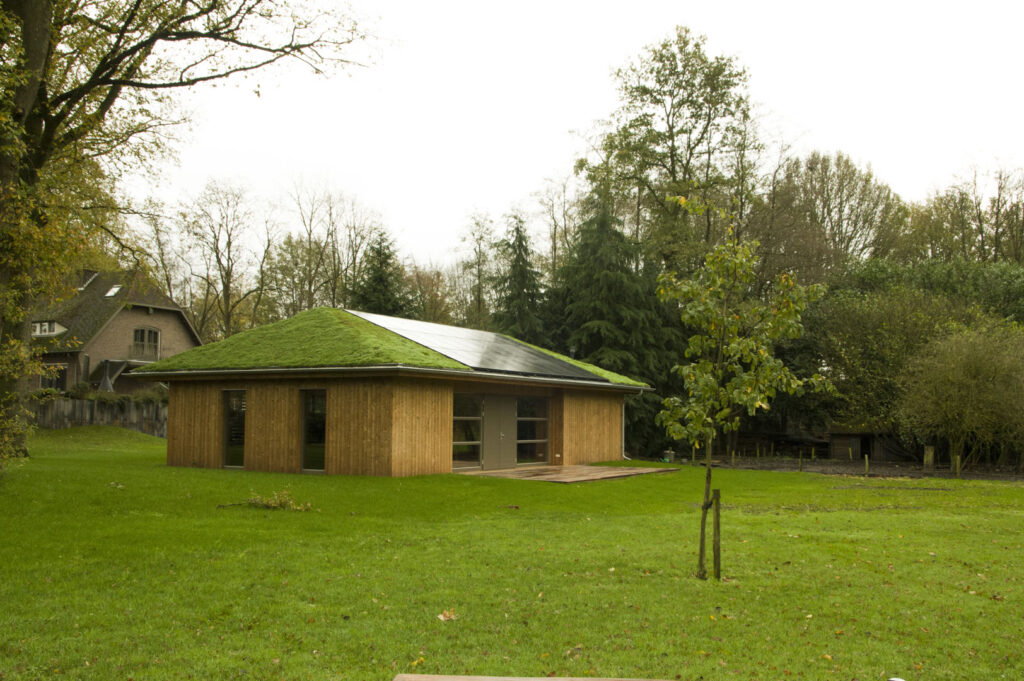 Een opdracht voor het ontwerpen en begeleiden van de bouw van een energiezuinig poolhouse. Het gebouw is opgetrokken uit houtskeletbouw met i-liggers en heeft een volledig aaneengesloten isolatieschil.