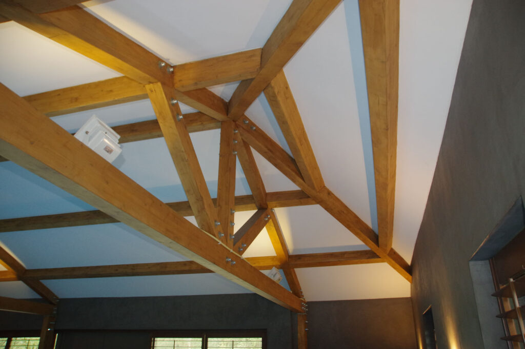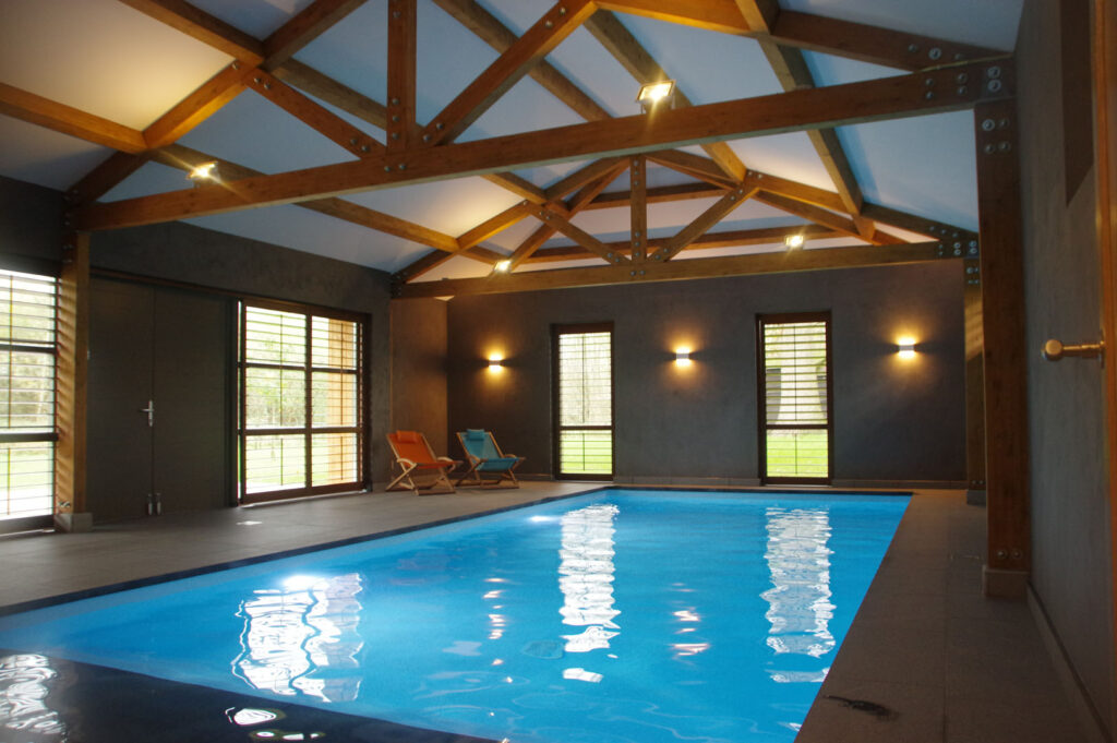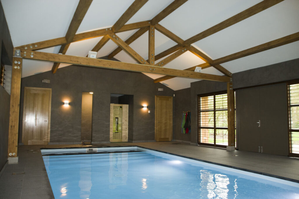Een energiezuinig poolhouse, gebouwd met houtskeletbouw en i-liggers, heeft een volledig aaneengesloten isolatieschil, triple glas ramen, en dubbele kierdichting deuren.