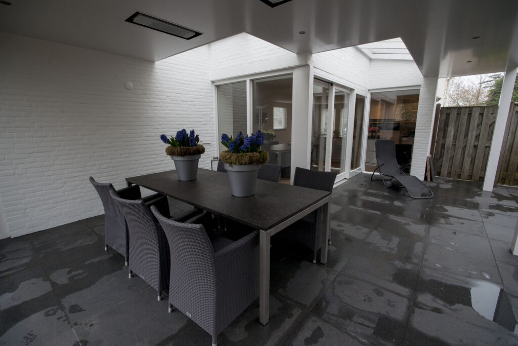 het project omvatte het ontwerpen van een verwarmde overkapping die daglicht behoudt en een moderne, ruime keuken met koffiehoek, om binnen- en buitenruimtes harmonieus te verbinden met oog op functie, stijl en comfort.